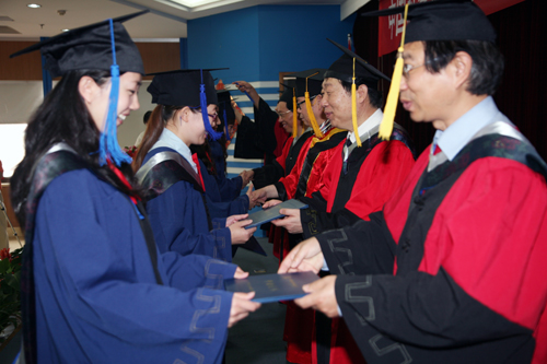 党委书记王启尧主持毕业典礼,首先宣读了2012年度通过毕业答辩的学生名单,并向毕业生表示祝贺。校长孙松和研究生导师代表共同为毕业生颁发学位证书、扶流苏。