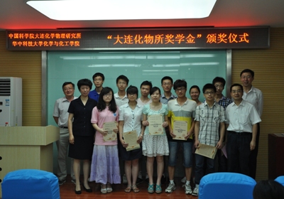 华中科技大学化学化工学院的颁奖仪式由副院长李涛教授主持,院长解孝林和熊博晖分别致辞。华中科技大学化学化工学院共有10名优秀本科生获得2011-2012年度“大连化物所奖学金”,获奖名单如下:周晓琳、刘妍、蔡明乐、张超、蓝欢、周笛、王硕、徐少怡、林锦池、陈满堂。