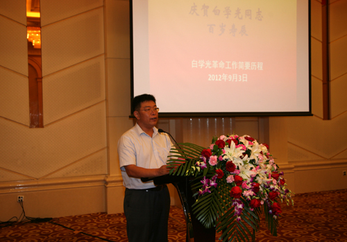 工会主席王斌贵宣读了中科院沈阳分院、八大关办事处等单位发来的贺信,党委委员李超伦代表所党委向白书记赠送了寿礼和寿金,青年党员代表向白书记敬献了鲜花,离退办主任王岩回顾了白老的革命和工作历程。
