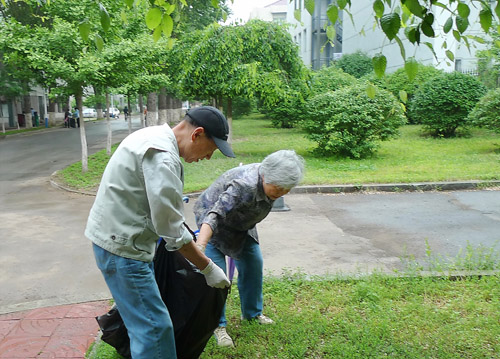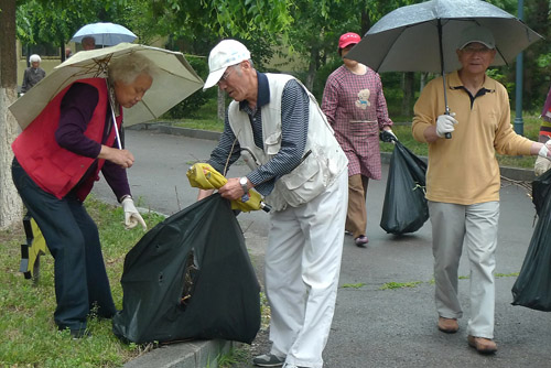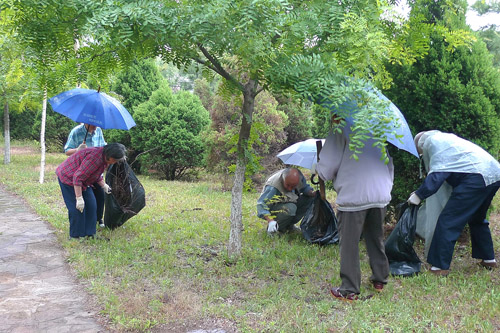 6月5日上午9:00,天空下着毛毛细雨, 60余位离退休职工志愿者提前来到离退办门前,大家几个人组成一小组,手提垃圾袋,沿着金属所南围墙,将李薰楼和工艺楼南侧花园里的石块、塑料、干树枝等垃圾捡拾起来。一个多小时的劳动结束了,大家手中的垃圾袋都装的满满的、重重的,每个人的脸上都挂满了汗水、雨水和开心的笑容。