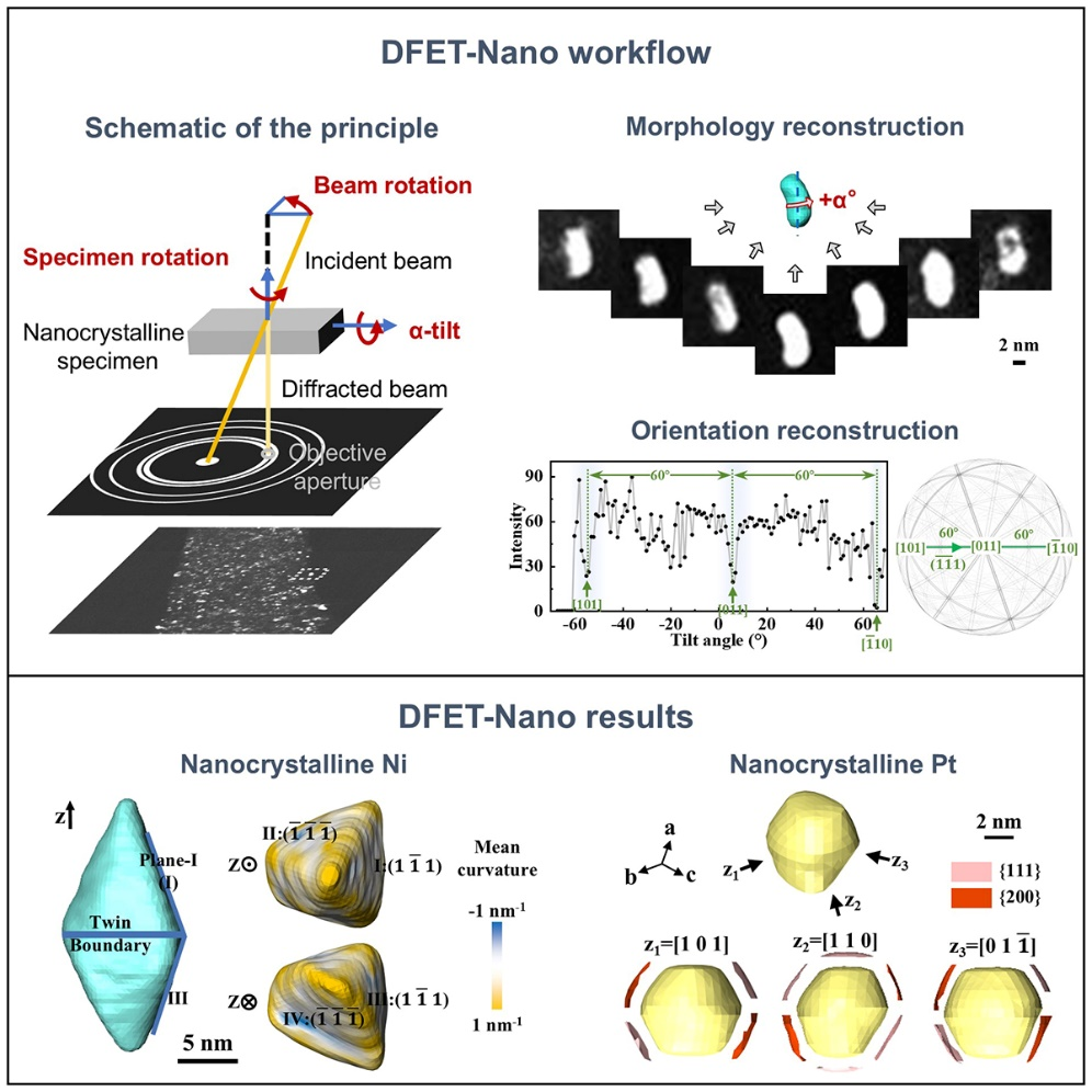 近日,中国科学院金属研究所李秀艳研究员与杜奎研究员合作,在纳米金属三维晶界结构表征方面取得进展。研究团队发展了一种暗场电子层析成像方法(Dark-Field Electron Tomography for Nanograins,DFET-Nano),实现了纳米晶粒三维形貌与晶体学取向的同步重构,并能够定量解析晶界面取向及其曲率特征。相关研究成果以“Revealing grain boundary plane and curvature of nanostructured metals in three-dimensional space with sub-nanometer resolution”为题发表在材料领域期刊Matter上。