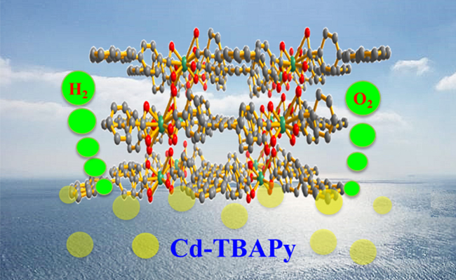在本工作中,该研究团队继续将宽光谱捕光新催化剂开发拓展至金属有机框架(MOFs)类材料,发现Cd-MOFs材料在可见光激发下具有水氧化和水还原的双重功能。通过合理选择1,3,6,8-四(4-羧基苯)芘作为有机配体,与镉离子配位合成出了新型的二维镉基金属有机框架单晶材料(Cd-TBAPy)。研究表明,该材料不仅具有良好的可见光吸收功能,同时具有合适的能带位置,能够满足光催化水分解的热力学要求。光催化测试表明,在担载合适的助催化剂及使用牺牲试剂的条件下,该材料可以在可见光照射下分别实现水氧化和水还原半反应,且在420nm光照射下,测得产氧反应的表观量子效率(AQE)为5.6%。通过荧光光谱和理论计算分析发现,合适的助催化剂担载及Cd-TBAPy具备的二维层状 共轭体系共同作用是该材料表现出独特光催化性能的主要原因。该研究结果表明MOFs类材料在光化学转化应用方面具有一定前景。