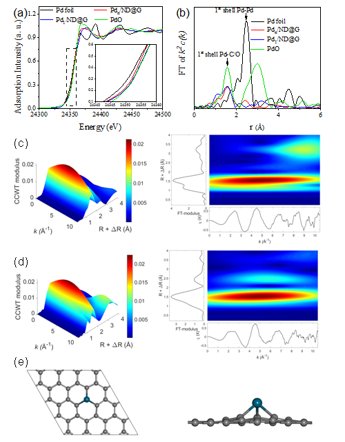 图3 (a) 钯X射线吸收近边结构谱图;(b) 傅里叶变换后R空间径向结构函数;(c, d) Pdn/ND@G和Pd1/ND@G的钯EXAFS振荡小波变换;(d) 最优结构模型图