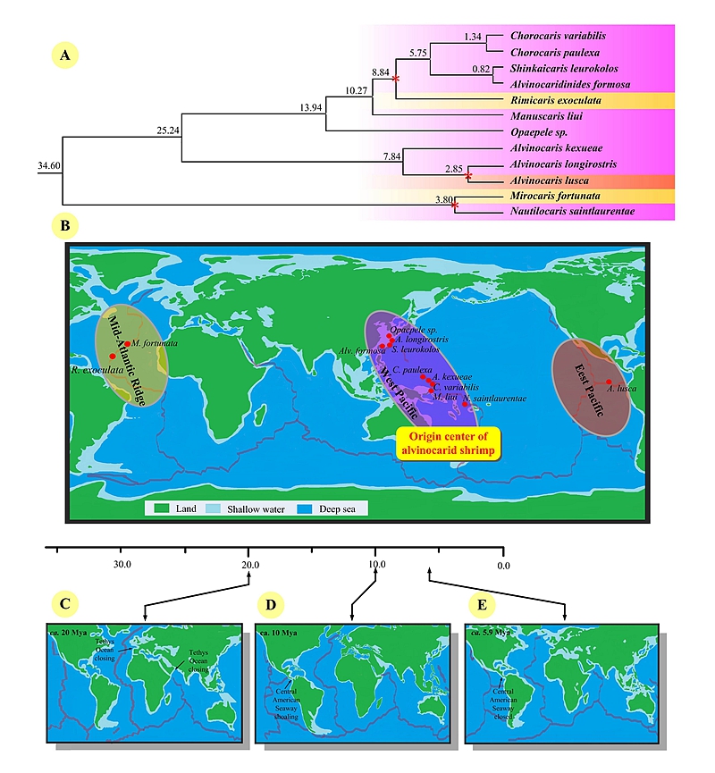 沙忠利研究团队基于线粒体cox1, 12S, 16S及核糖体18S, H3, NaK等6个基因联合分析,开展了十足目真虾下目的分子系统演化研究,构建了高准确度的系统发育树,确定了深海种类在系统树上的位置。研究结果揭示了阿尔文虾的祖先由浅海入侵到深海,然后入侵到热液,具有“浅海-深海-热液”进化模式;阐明阿尔文虾大约在34.60百万年(始新世)开始占据热液生态系统;明确阿尔文虾起源于西太平洋的弧后盆地,先后于3.80百万年和8.84百万年经由西南印度洋中脊(Southwest Indian Ridge)进入大西洋,并于2.85百万年通过太平洋-南极海岭(Pacific-Antarctic Ridge)进入东太平洋,最终形成目前的分布格局。本研究为揭示深海热液大型生物起源和演化提供了重要的理论依据。