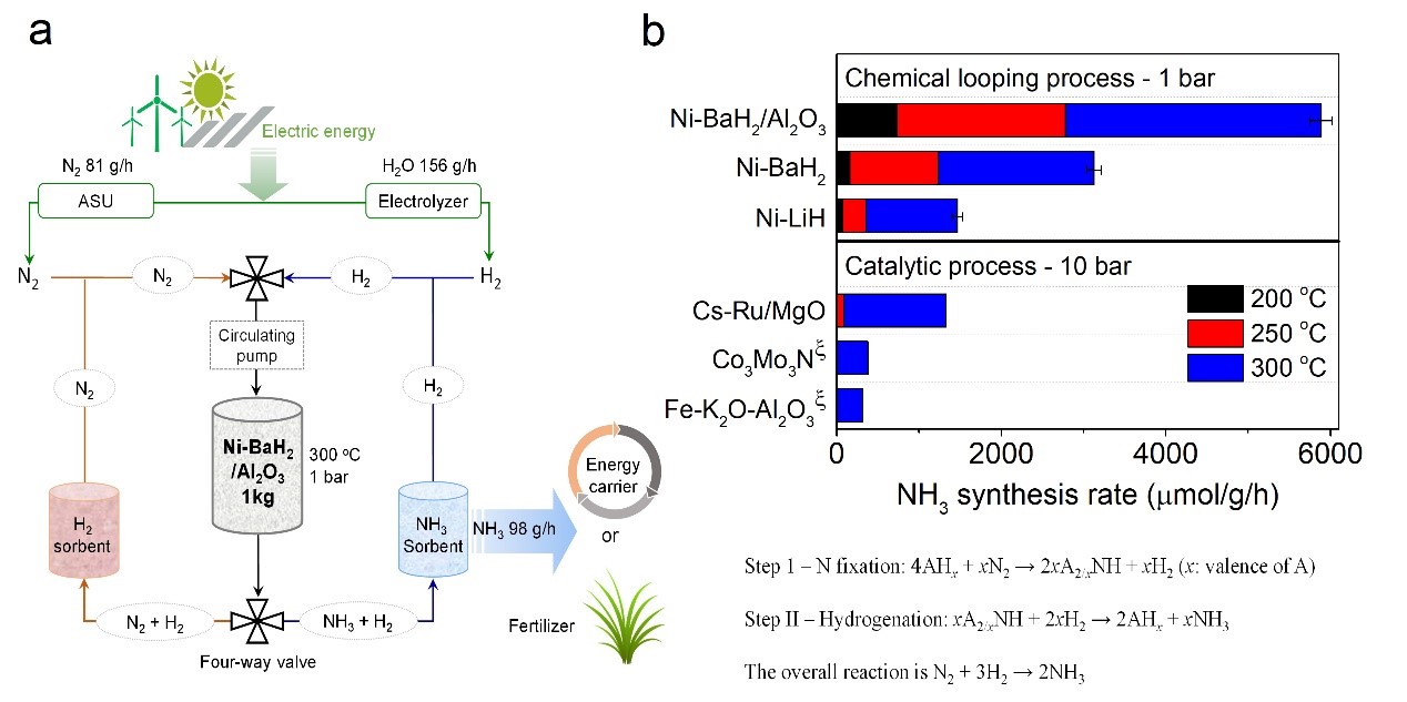 基于此项研究结果,该研究团队构建了一条基于可再生能源的化学链合成氨工艺流程,即利用可再生能源产生的电能进行空分制氮和电解水制氢,然后将氮气和氢气交替通入载有氢化物的反应器中分别进行氮化和加氢反应,未反应的气体经分离纯化后循环使用。此工艺可在较为温和条件下进行(常压,100-300 C),避免了在Haber-Bosch过程中高能耗的气体压缩过程,显著提高了能效。其中合成氨及吸附分离氨等部分单元已经进行了实验验证。此工艺为可再生能源的储存与利用及小规模分布式合成氨工厂的构建提供了一个方案。