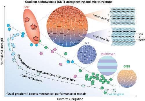 最近,中国科学院金属研究所卢磊研究员课题组和美国布朗大学高华健教授研究组合作在这一领域取得突破性进展。他们发现增加结构梯度可实现梯度纳米孪晶结构材料强度—加工硬化的协同提高,甚至可超过梯度微观结构中最强的部分。梯度纳米孪晶强化的概念结合了多尺度结构梯度,进一步提高了材料的强度极限,并为发展新一代高强度/延性金属材料提供了新思路。