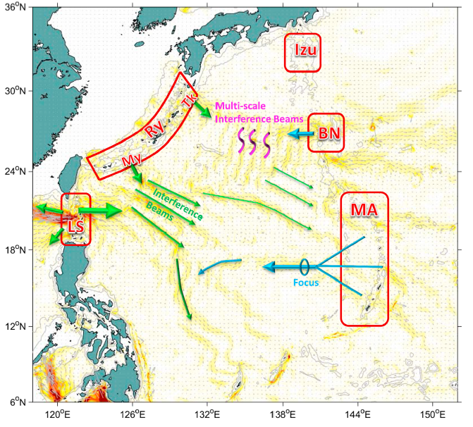 本研究给出了西太平洋菲律宾海半日内潮多源区干涉调制下的长距离能量辐射路径图,不仅能够指导西太针对内波强化观测站点的合理选定,也可辅助基于卫星高度计和现场观测资料准确提取多源内潮信号。该工作可对加深理解深海多尺度能量串级过程、改进海洋模式次网格参数化方案提供新思路。同时,因为菲律宾海涵盖第一岛链和第二岛链,是我国从近海走向大洋的关键海区,该海域内潮系统研究对于我国海洋环境保障也具有重要的应用价值。