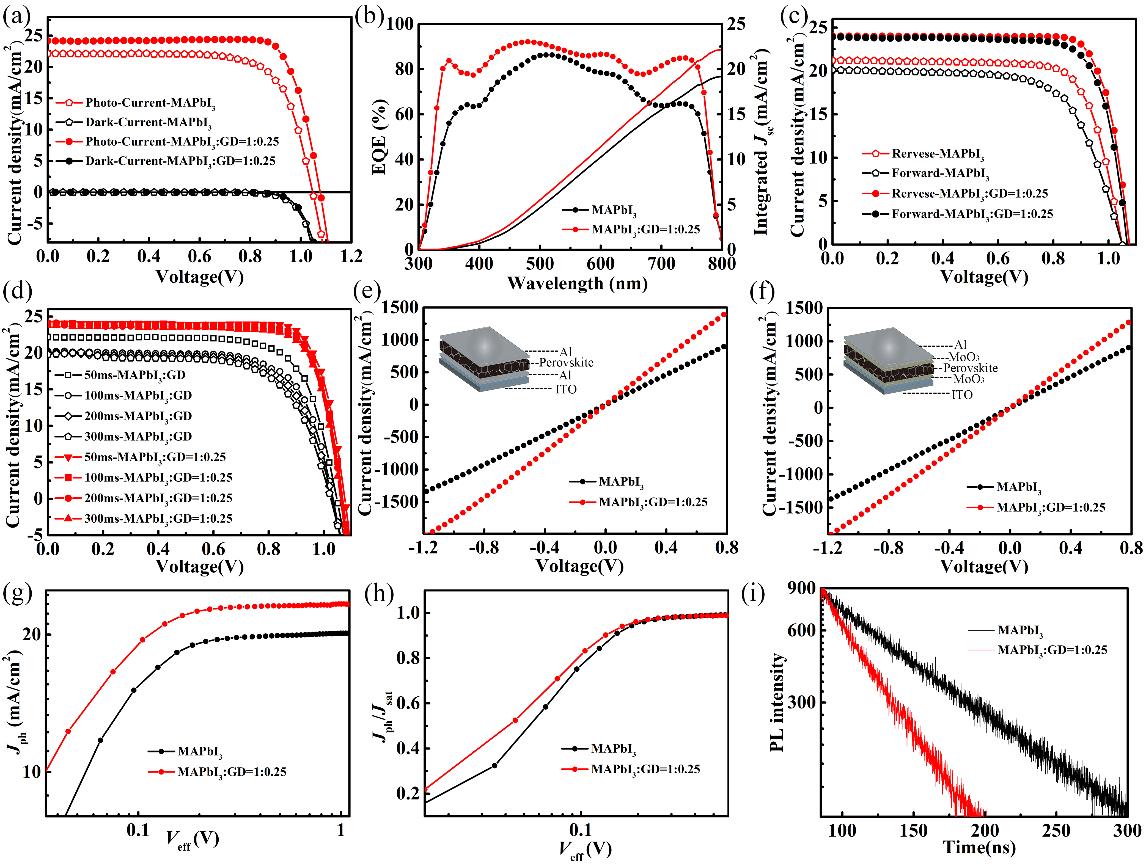 随后,研究人员从瞬态荧光、激子产生率、导电性等方面探究了器件性能提升的原因,结果表明石墨炔的引入不仅有效减少了晶界,抑制了电荷在晶界处的复合,同时有效提高了电荷的传输,这些效果均有利于器件填充因子和短路电流密度的提高,进而提高了器件性能。同时由于钙钛矿薄膜质量的提高、缺陷态密度的减少,使得器件的迟滞效应和稳定性也得到极大改善。