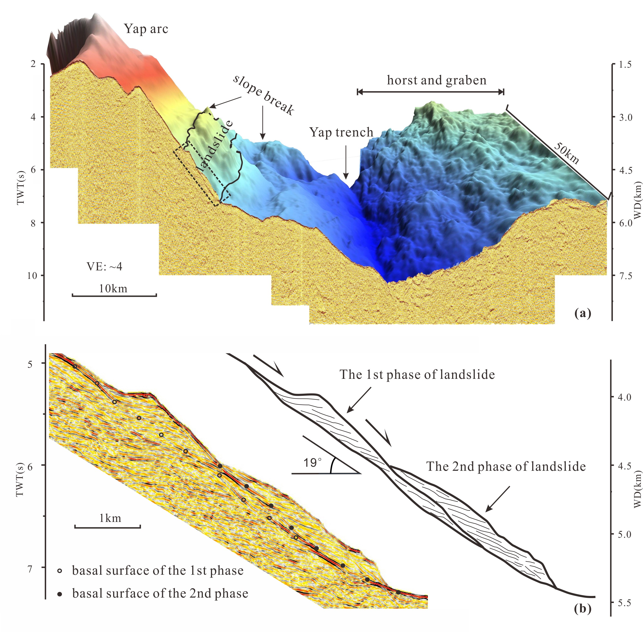 团队利用“科学”号在该区域采集的多波束和多道地震数据,对雅浦俯冲带的地貌-沉积特征进行研究。研究揭示,雅浦弧前区域发育一个大型滑塌体,在4000m水深处形成了明显的坡折带,而前人一直认为该坡折带是帕里西维拉地壳内岩性界面出露海底产生的断裂带。该研究否定了前人的认识并给出新的解释,认为在俯冲板片前缘细致刻画了一个正断层发育带,其成因与板片前缘挠曲作用相关;在俯冲板片内部地层内识别了强烈的不整合面,其记录了卡罗琳洋脊的初始张裂。该观点修正并完善了雅浦俯冲系统的演化模式,对于重新阐明雅浦俯冲带的演化模式及过程具有重要意义。