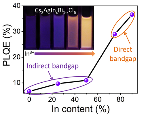该团队研究人员合成了一系列双钙钛矿纳米晶:Cs2AgInxBi1-xCl6(0≤x≤1)。通过调节双钙钛矿中In和Bi的比例可实现由间接带隙(x<0.75)到直接带隙(x≥0.75)的转变。采用飞秒瞬态吸收光谱分别研究了具有间接带隙及直接带隙纳米晶的激发态载流子动力学,结果表明间接带隙纳米晶存在较为明显的“亚带隙态”(Sub-band gap),能捕获激子形成非辐射中心,因此发光效率低。而在直接带隙纳米晶中,并未探测到明显的“亚带隙态”,激子可以直接复合发光。通过调节表面活性剂来钝化缺陷态,直接带隙纳米晶在紫光范围的发光量子产率可达36.6%,接近于含铅钙钛矿纳米晶的性能。该研究为进一步寻找高性能非铅钙钛矿材料提供了新的思路。