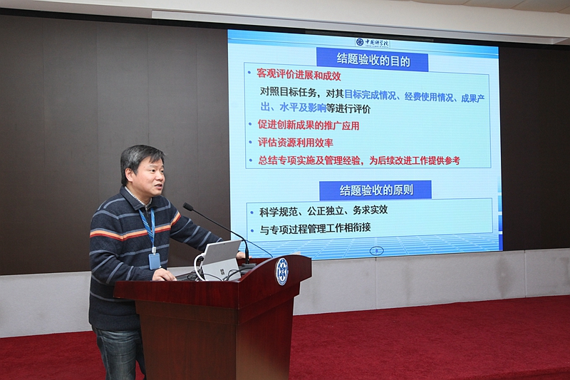 会上中科院发展规划局黄晨光副局长对专项验收整体情况进行了介绍,专项负责人孙松研究员对专项实施及管理总体情况进行了汇报,各分项验收专家组长分别宣读了科技目标与科技管理、财务分项、档案分项验收意见。