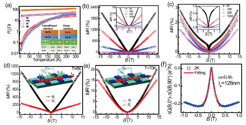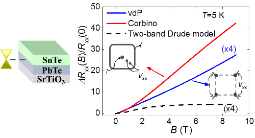 对超高线性磁电阻PbTe/SnTe异质结的深入研究发现,利用Van de Pauw与Corbino两类测量方法均可测得未饱和线性磁电阻。通过分析,PbTe/SnTe拓扑晶体绝缘体异质结的电输运行为由多种载流子贡献。在低温区,电输运由表面态Dirac电子主导;在室温区,电输运由体空穴主导。进一步深入研究发现,PbTe/SnTe异质结的线性磁电阻不能由经典Drude模型描述,说明其电输运行为具有不同于传统的电输运物理本质。这项实验工作为拓扑材料的电输运理论研究提供了一种新的实验现象与实验数据支撑。