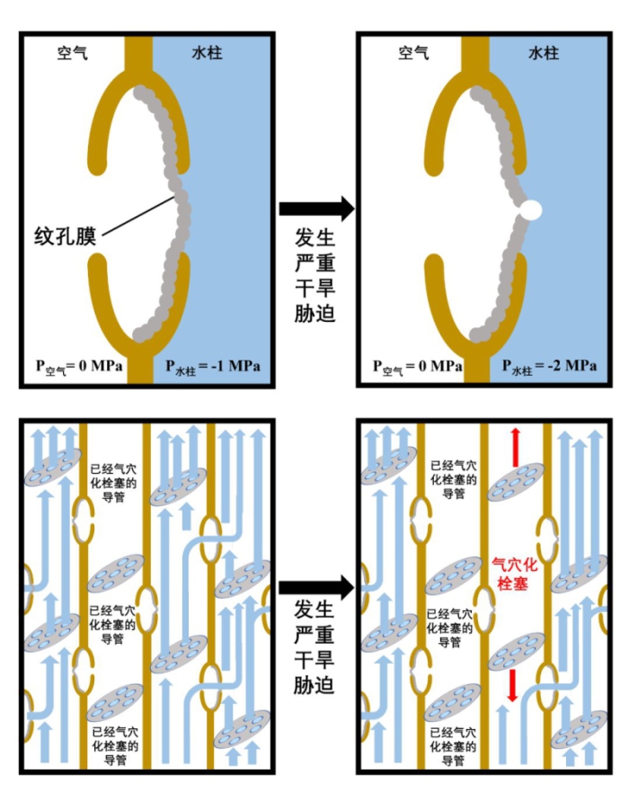 严重干旱胁迫下,组织脱水将会诱导固沙灌木木质部发生气穴化栓塞,水分传输功能下降甚至丧失。灌木能否在干旱条件下存活,与其避免栓塞导致水力传输失败的能力密切相关。这种能力一方面与木质部气穴化抵抗力有关,同时还取决于其调控叶片蒸腾和避免干燥脱水的能力。