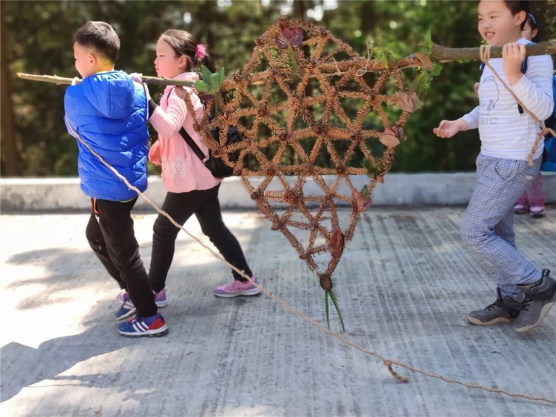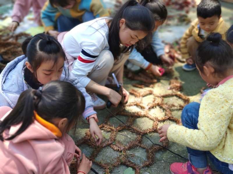 活动过程主要以蜜蜂为切入点,通过观察、记录蜜蜂及其巢穴的特点,了解蜜蜂的相关知识。再通过动手操作,在山林搜寻天然材料,使用杉树叶等,模拟蜜蜂编织六边形、正方形、三角形艺术巢穴,并计算每组蜂巢的面积,通过比较、分析,了解蜜蜂筑造六边形巢穴的优势,并根据学到的知识创作自己的产品。孩子们通过学习蜜蜂的智慧,发挥想象力,画出并分享了各自的创意设计,有的仿照天然蜂巢制作了人工蜂巢,有的设计了具有未来感的建筑。