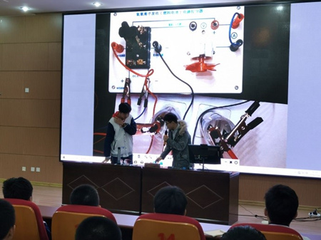 活动中,先进储能材料与技术研究组陈国栋首先为同学们讲解了什么是燃料电池,他以一个个生活中常见的不同类型的电池为开始,先给大家引入了电池的概念,以及电池的共同特点,并通过与常见电池的对比,引出了一类特殊的电池——燃料电池,通过生动的动态图片给同学们传递了燃料电池的优越性。通过现场展示简单的氢燃料电池实验装置,让同学们更生动地理解燃料电池的特殊之处和工作原理。