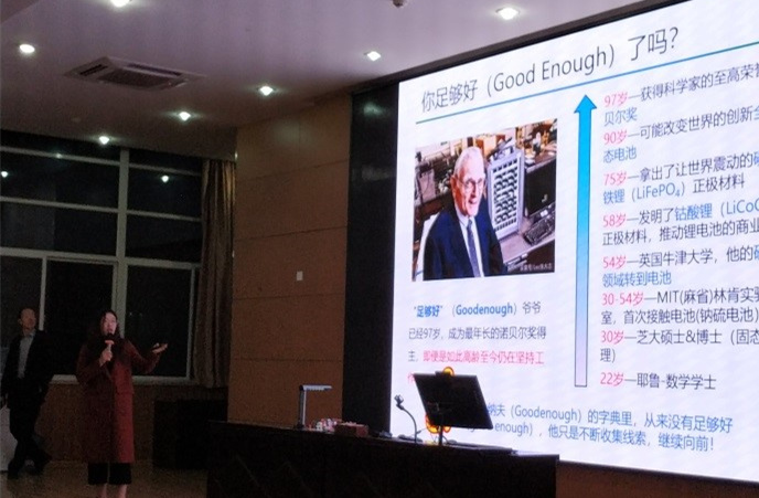 先进储能材料与技术研究组吴悦以美国著名科学家2019年诺贝尔化学奖得主Goodenough的生平事迹为切入点,详细介绍了锂电池。她结合视频动画讲解了生活中的锂离子电池以及锂离子电池的工作原理,以Goodenough对科研事业的追求精神鼓舞同学要坚持不懈地朝自己的目标努力。