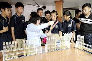 当天上午十时左右,主讲人俞志明研究员为同学们讲解了有害藻华的基本知识,包括藻华生物的多样性、有害藻华的形成原因和危害,以及有害藻华的防控方法和应急消除的成功应用案例等,并介绍了几种海洋环保的小妙招,鼓励同学们积极加入到海洋环保的队伍中来。之后,中科院海洋所宋秀贤研究员带领同学们体验、观摩了常见藻华生物的显微观察和几种典型有害藻华的治理实验,使同学们更加直观的认识了改性粘土对有害藻华的去除作用。面对显微镜下形态各异的藻华生物、直观的絮凝去除实验现象,学生们跃跃欲试、踊跃提问,科研人员耐心细致的一一作答,现场气氛十分活跃。