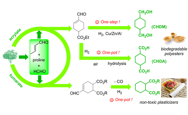 该研究团队前期发展了以木质纤维素为原料的生物质路线合成聚酰亚胺单体均苯四甲酸(Green Chem.)。在此基础上,本工作以生物质平台化合物(可从生物质获得的)甲醛、巴豆醛和丙烯酸酯/富马酸酯为原料,发展了脯氨酸催化的三组分环加成反应,然后通过调节后续过程,分别选择性合成CHDM、CHDA和1,2-环己烷二甲酸酯,两步总收率均可达到70%以上。通过生命周期评价(LCA)方法对比生物质路线和石油路线,结果表明在生产CHDM和1,2-环己烷二甲酸酯方面,生物质路线具有更低的碳排放;在生产CHDA方面,通过酸催化水解的方式,也可以获得更低的碳排放,生物质路线展现出了积极的碳减排潜力。