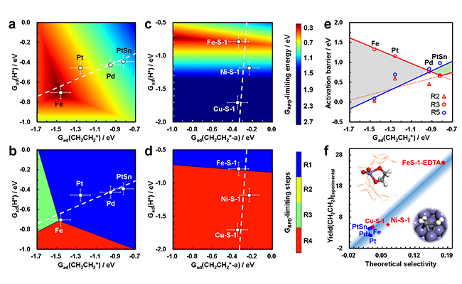 本工作通过研究两个维度的描述符(*C2H4和*H的吸附自由能),构建了反应相图,统一了Fe和Fe-S-1催化剂不同的反应机理。研究发现,金属催化剂Pt、Pd和PtSn的本征活性(转化率)受反应第一步乙烷脱氢(R1)的限制,而Fe位于R1、R3(乙烯脱附)和R4(氢气脱附)的交点处,即Fe的催化性能会受到上述三个步骤的同时影响。对于沸石S-1改性的催化剂,Ni-S-1和Cu-S-1的速率限制步骤是R4,而Fe-S-1恰好位于R1和R4的交界处,其相对较弱的H*吸附使得更容易生成氢气和脱附。该工作通过微观动力学模型从理论上统一了金属和分子筛体系的反应收率,为非氧化脱氢反应催化剂的设计提供了新的方向。