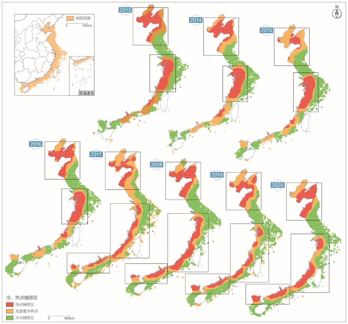 图1. 中国大陆沿海冷热点渔业捕捞区(Geng et al., 2023)