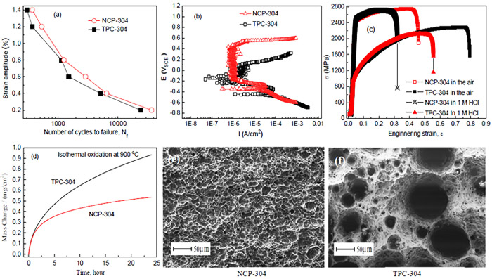 中国科学院金属研究所王胜刚及其合作者利用深度轧制技术制备出纳米晶304不锈钢板材(NCP-304,整体纳米化)。前期工作表明,与普通304不锈钢(TPC-304)相比,NCP-304点腐蚀和均匀腐蚀阻力提高(腐蚀速率降低,钝化膜击穿电位提高了400 mV,钝化区间变宽370 mV)。 NCP-304抗高温氧化(900 °C空气中) 和耐应变疲劳(应变范围0.2%- 1.4%)性能提高。应力腐蚀(应变速率2.5 × 10−6 s-1)实验表明,室温空气中,与TPC-304比较,NCP-304屈服和抗拉强度分别提高1520 MPa和458 MPa;室温1 mol/L HCl溶液中,屈服和抗拉强度分别提高1487 MPa和591 MPa。NCP-304在空气和1 mol/L HCl溶液中延伸率分别为42% 和30%,NCP-304抗应力腐蚀性能提高。