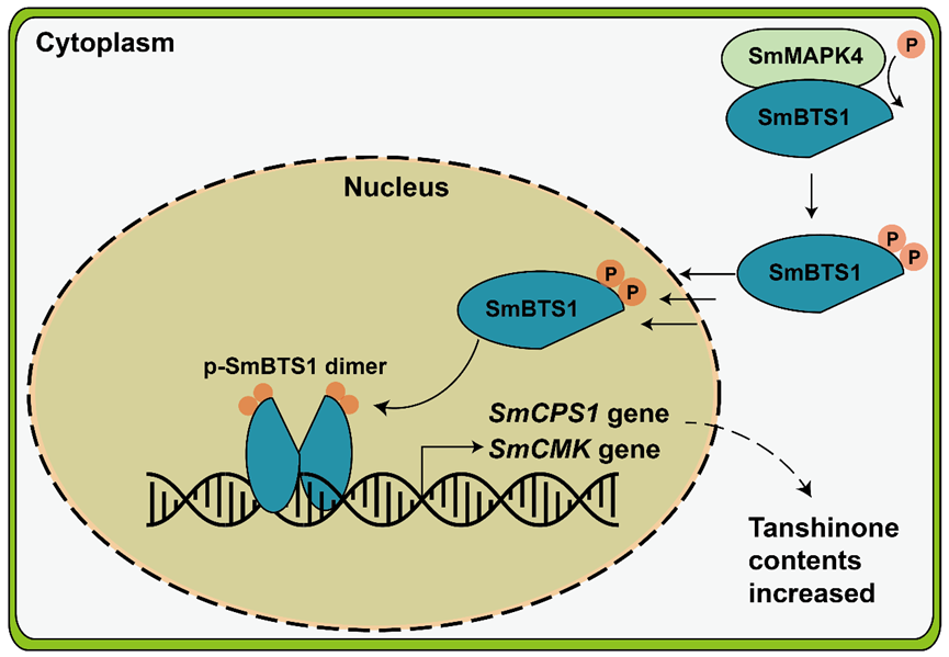 图1. SmMAPK4-SmBTS1-SmCPS1促进丹参酮合成作用模式图