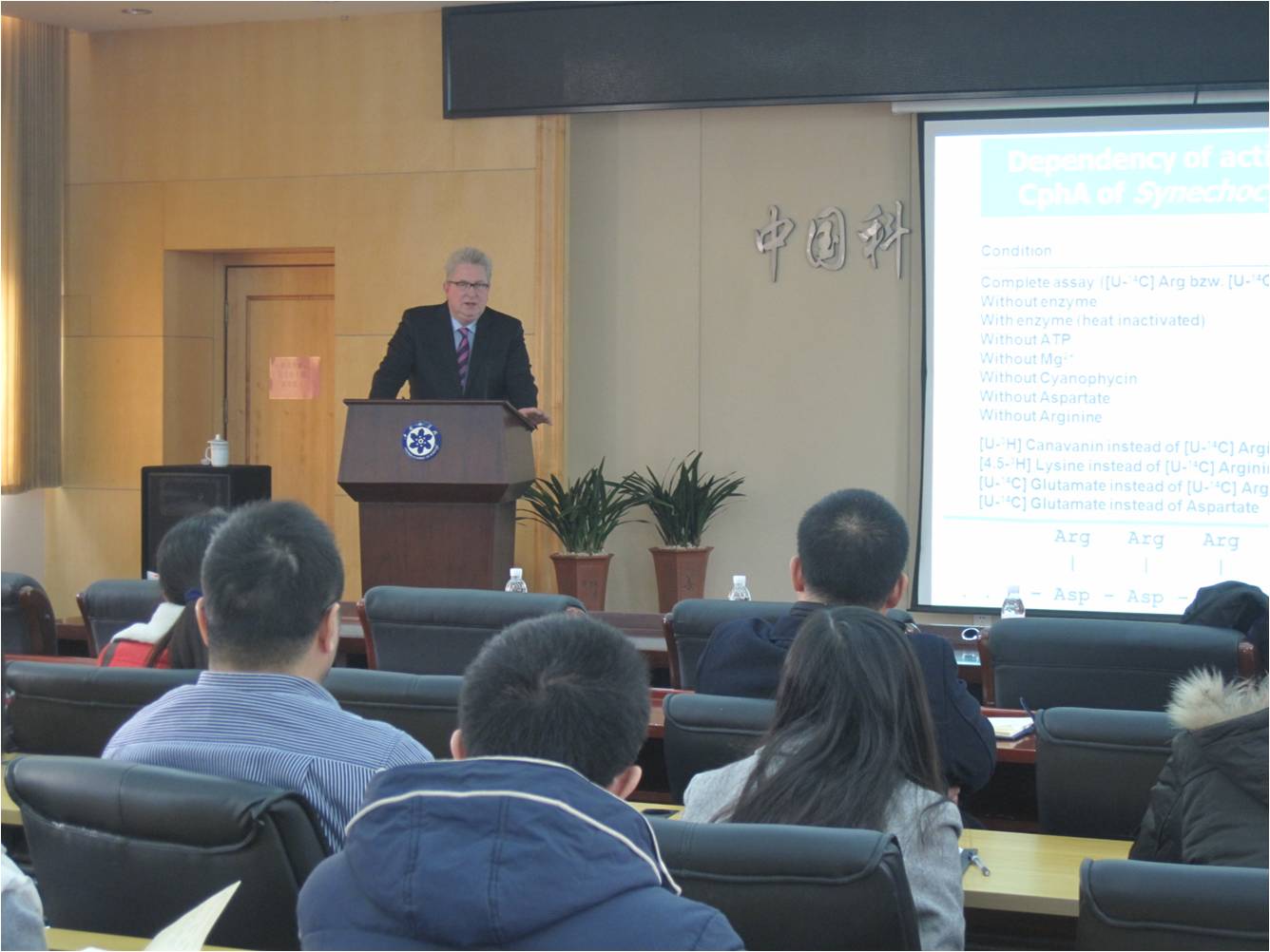作为“国际专家高层论坛”主讲人,Steinb chel教授作了题为“Cyanophycin: A Neglected Biopolymer”的学术报告,报告由微生物代谢工程团队罗泉博士主持。报告中,Steinb chel教授详细介绍了cyanophycin这种聚合物的天然来源、结构特征、物理性质等,展示了其实验室在cyanophycin及二肽的生物合成方面的研究进展,介绍了他们在相关化合物商业化方面的现状。报告后参会人员就相关学术问题与Steinb chel教授进行了交流研讨。