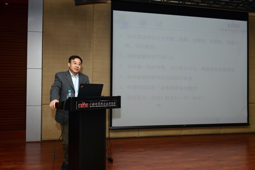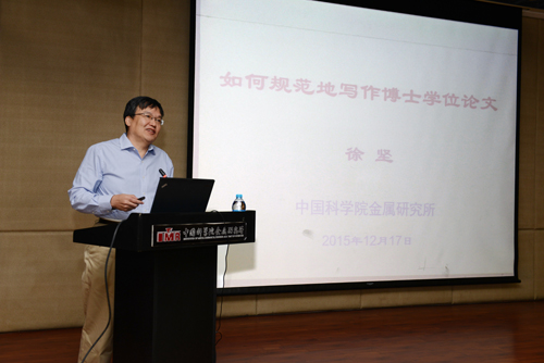 非平衡金属材料研究部徐坚研究员针对学位论文中存在问题,作了“如何规范地写作博士学位论文”报告。徐老师的报告引经据典,围绕博士学位论文的性质、写作能力是育人的重要内容、学位论文的基本文体和论文写作的路线图等四方面,通过对绪论、实验方法、内容部分、总结论等各部分详实的讲解,谈了他对学位论文撰写的认识,以及如何指导研究生规范撰写学位论文的建议。