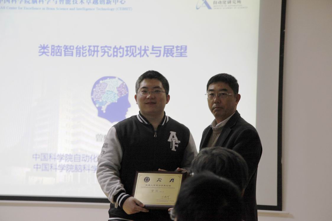 报告会开始前,韩建达为曾毅颁发了“机器人前沿学术论坛”荣誉证书。