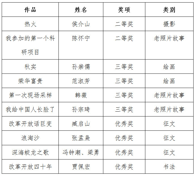 活动以纪念“科学的春天”40周年为主线,通过多种形式,聚焦改革开放和“科学的春天”40年来中科院和金属所重大改革创新举措和重大创新成果,展现新时代金属所人的精神风貌。活动启动以来,全所职工、研究生踊跃参与,共收到233件作品。经党办初审、专家评审,评选出一等奖7个、二等奖11个、三等奖22个。