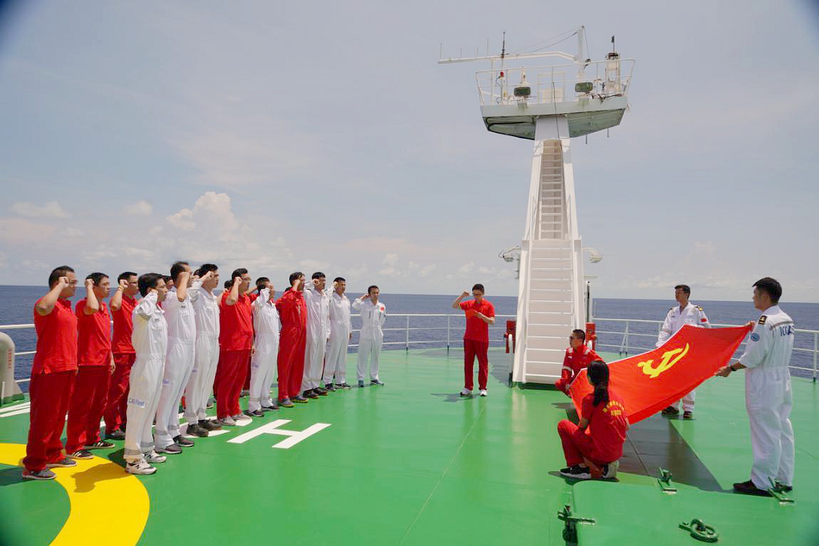 11时40分,西太平洋海面波光粼粼,晴空万里。“科学”号海上堡垒临时党支部全体党员、入党积极分子列队整齐,迎接穿越赤道的庄严时刻。全体人员在五星红旗前齐唱国歌,在雄壮的歌声中“科学”号跨越赤道线进入南半球。随后,全体党员在航次科考队长贾凡领读下重温入党誓词,嘹亮的誓言、真挚的情感让现场所有人都深受感染,更加坚定了作为一名共产党员践行誓言、终生不渝的初心信念。