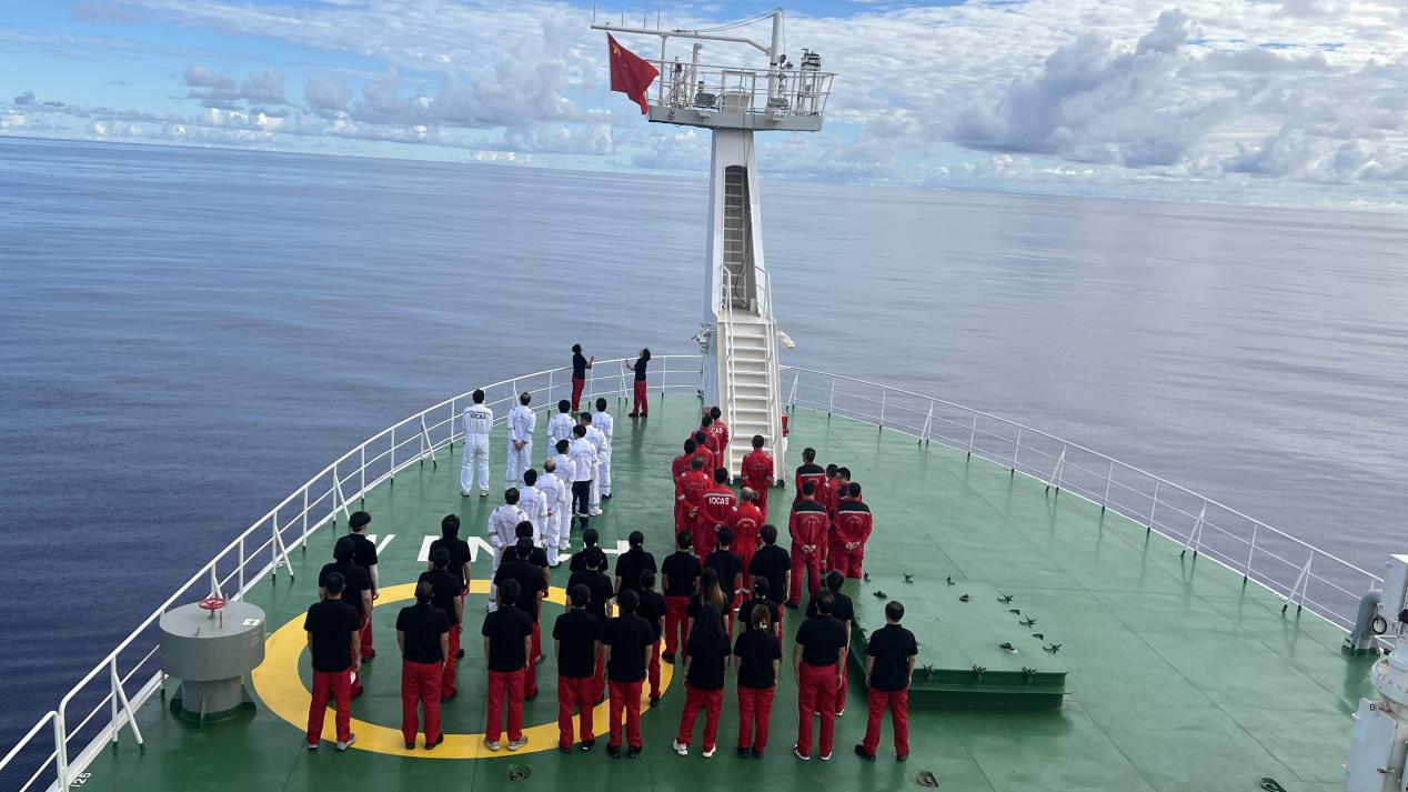 10月1日,晨曦微露,在距离祖国1700海里之外的深海大洋上,“科学”轮科考船正以坚实的身躯稳稳劈开太平洋上的碧波,五星红旗在全体船队员的注目礼中冉冉升起,激昂的《义勇军进行曲》回荡在海天之间。一场跨越时空的国庆升旗仪式庄严举行。这是“科学”号运行13年来第12次在海上庆祝国庆,全体科考队员以海洋为笺、以星辰为墨,向祖国献上最深情的祝福。