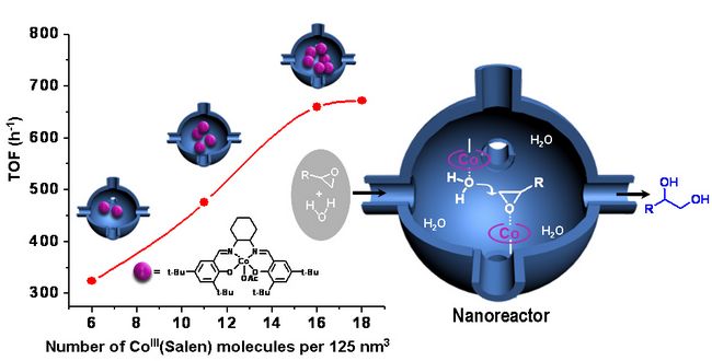 研究发现,限域在纳米笼内的金属络合物分子催化剂处于自由运动状态,从而在纳米尺度上保持了其均相催化的本征特性,由于双中心协同耦合效应,显示较高的本征催化活性。采用封装方法制备的催化剂在宏观上是固体催化剂。因此,纳米反应器中的催化兼具多相和均相催化之优点。利用这一策略该研究团队在纳米反应器中实现了双分子催化氧化水分子放氧的反应(Energy Environ. Sci., 2012, 5, 8229)和环氧化合物动力学拆分反应(Chem. Sci., 2012, 3, 2864)。