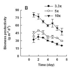 图2. 产油栅藻的贴壁培养产率验证(A:室内,B:室外)
