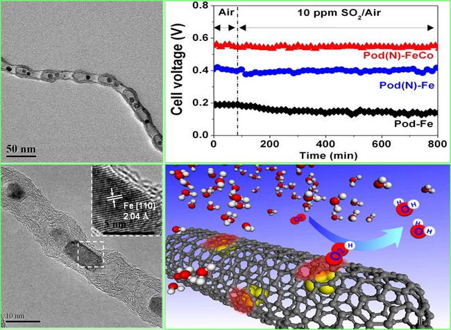中科院大连化学物理研究所催化基础国家重点实验室邓德会博士、潘秀莲研究员、包信和院士等与洁净能源国家实验室燃料电池研究部合作,在对碳纳米管限域效应研究取得系列进展的基础上,努力创新合成制备方法,创造性地将铁基金属纳米粒子限域到具有豆荚状结构(Bean-Pod-Like)的碳纳米管的管腔中,采用该研究组新近研制成功的深紫外光发射电子显微镜(DU-PEEM),并借助上海光源先进的X-射线吸收谱(XAS),结合理论计算,首次观察到金属铁的活性d电子通过与组成碳管壁的碳原子相互作用而“穿过”(Penetrating)碳管管壁,富集在碳管外表面的电子直接催化分子氧的还原反应(ORR)。实验和理论研究进一步证实,在这一体系中,包裹纳米金属铁的碳壁阻断了反应气体与铁纳米粒子的直接接触,从原理上避免了反应过程中活性金属铁纳米粒子的深度氧化,以及反应气氛中其它有害组分对催化剂的中毒,从而在根本上解决了纳米金属铁作为燃料电池阴极催化剂的稳定性难题。进一步对包裹金属纳米粒子的碳壁进行杂原子(如氮原子)掺杂和改变包裹其中的金属纳米粒子组分,对电极材料的催化性能起到明显的调变作用。当碳纳米管管壁氮掺杂浓度为3.3 wt%,包裹Fe-Co纳米合金时,在完全相同的操作条件下,电池的功率密度可以达到以20%Pt-C催化剂的60%。特别是,在10 ppm的有害成分硫(SO2)存在时,电池仍保持了优异的活性和稳定性。这一结果近期被《德国应用化学》 (Angewandt Chemie International Edition, 2012, DOI: 10.1002/anie.201204958)在线发表。