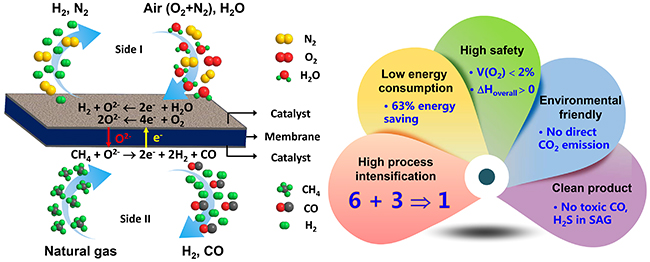 近日,中国科学院大连化学物理研究所催化基础国家重点实验室无机膜与催化新材料组(504组)杨维慎研究员和朱雪峰研究员带领的研究团队在透氧膜反应器同时制备合成氨原料气和合成液体燃料原料气的研究中取得进展,研究成果发表在Angew. Chem. Int. Ed.杂志上。