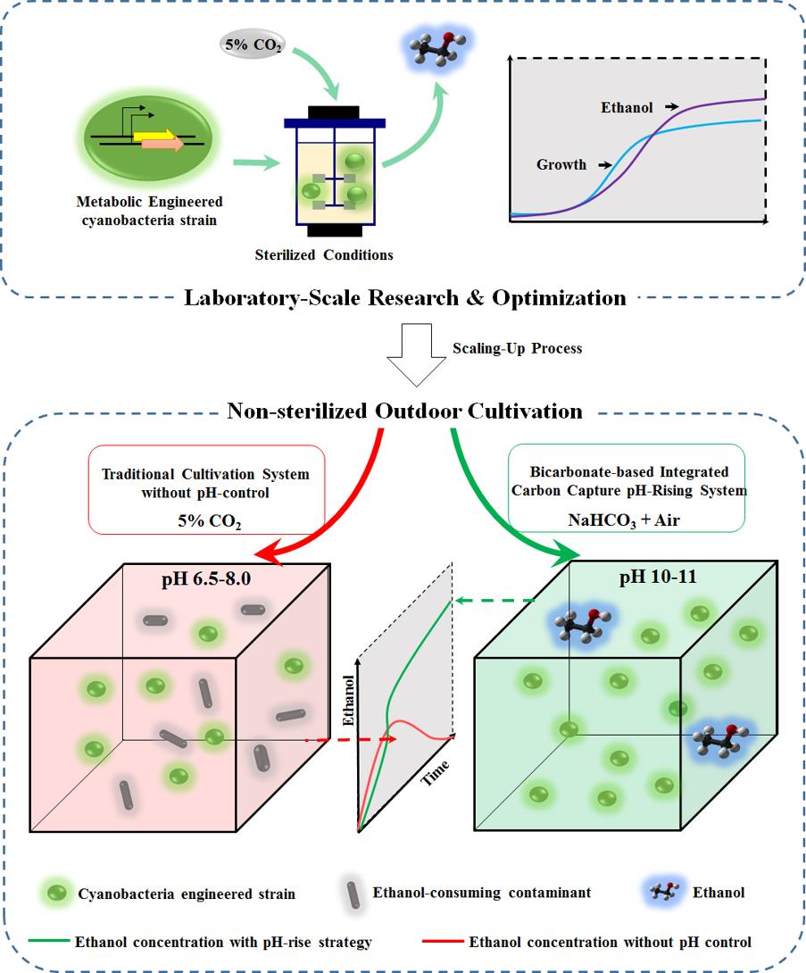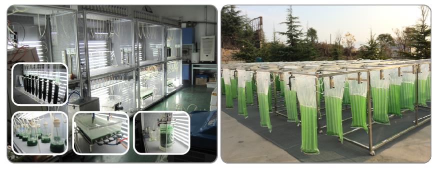 图2. 蓝细菌乙醇光合工程藻株的实验室培养和户外规模化培养