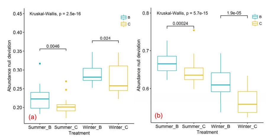 图2.随机过程和决定性过程对细菌(a)和真菌(b) 多样性作用的相对重要性