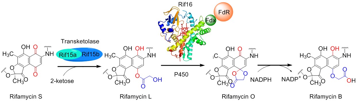 基于2011年赵国屏院士研究组通过分子遗传学方法确认关键基因Rif15/16负责利福霉素SV到B转化的体内研究工作基础,本工作中研究人员成功在大肠杆菌中异源表达得到可溶性的转酮酶Rif15和细胞色素P450单加氧酶Rif16,在体外通过酶活重建、产物结构表征、13C标记实验和Rif16晶体结构解析彻底阐明了利福霉素SV转化为利福霉素B的生物合成途径及这两个酶的功能和催化机制,改写了Ghisalba等在36年前提出的“旧模型”(J. Antibiot. 35, 1982: 74-80)。研究团队发现,利福霉素SV首先在有氧条件下可自发被氧气化学氧化成利福霉素S,进而在转酮酶Rif15的作用下将2-酮糖的一个C2基团转移至利福霉素S上并重排生成含有C-O酯键结构的利福霉素L。接着P450单加氧酶Rif16拔取利福霉素L C-39位羟基上的氢原子,形成的氧自由基进攻临近芳环C-4位形成五元环结构,然后再经一系列电子重排和第二次C-1位置酚羟基上氢原子的拔取,生成不稳定的中间体化合物利福霉素O。该化合物在电子供体NADPH存在条件下,迅速被水解还原形成稳定的终产物利福霉素B。在此过程中,转酮酶Rif15表观上催化一个独特的C-O成键反应(通过常规的C-C成键和非常规重排形成);而P450单加氧酶Rif16则通过一个五元环的介导,成功实现了一种十分罕见的“酯醚转化”反应。这两个全新催化机制的发现,进一步拓宽了转酮酶和P450单加氧酶这两种常见生物催化剂的催化反应类型,加深了领域内对这两种酶的认识。该项研究的成功还将为进一步利用合成生物学方法有效进行新型利福霉素发现和工业菌种改造,进一步提升利福霉素的产量提供全新的理论依据。
