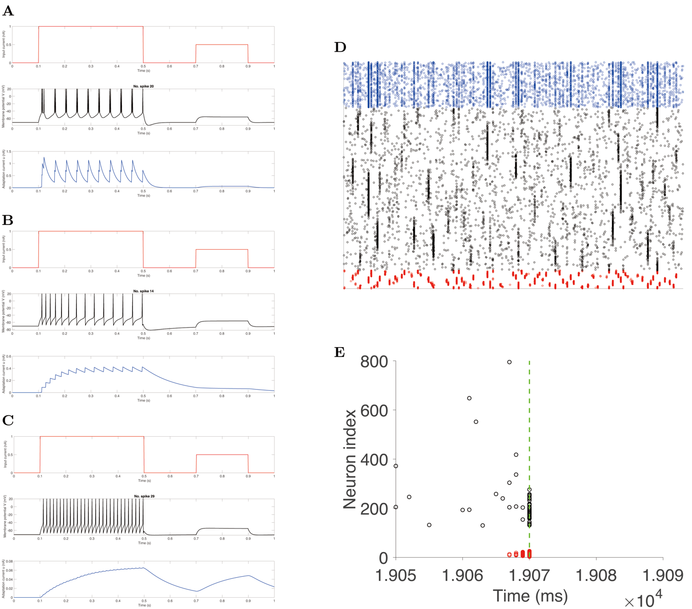 图2 CA3中三种不同类型细胞构成的脉冲神经网络能产生集群放电。(A)规则发放型细胞在电流(上图)输入下的产生规则的放电模式(中图),自身的适应电流(下图)会促使细胞停止放电; (B)爆发式发放型细胞的放电模式; (C)抑制性中间神经元的放电模式。(D) 三种细胞构成的循环网络随时间的放电脉冲,横轴为时间,纵轴为细胞的编号。每一个圆圈代表一个电脉冲。抑制性细胞、规则发放型细胞和爆发式发放型细胞的放电脉冲分别用蓝、黑和红色表示;(E) 网络中两类锥体细胞参与尖波放电的动态过程的示例,是D的局部放大。绿色虚线表示尖波放电的时刻。尖波放电由爆发式发放型细胞启动,并扩展到整个网络。