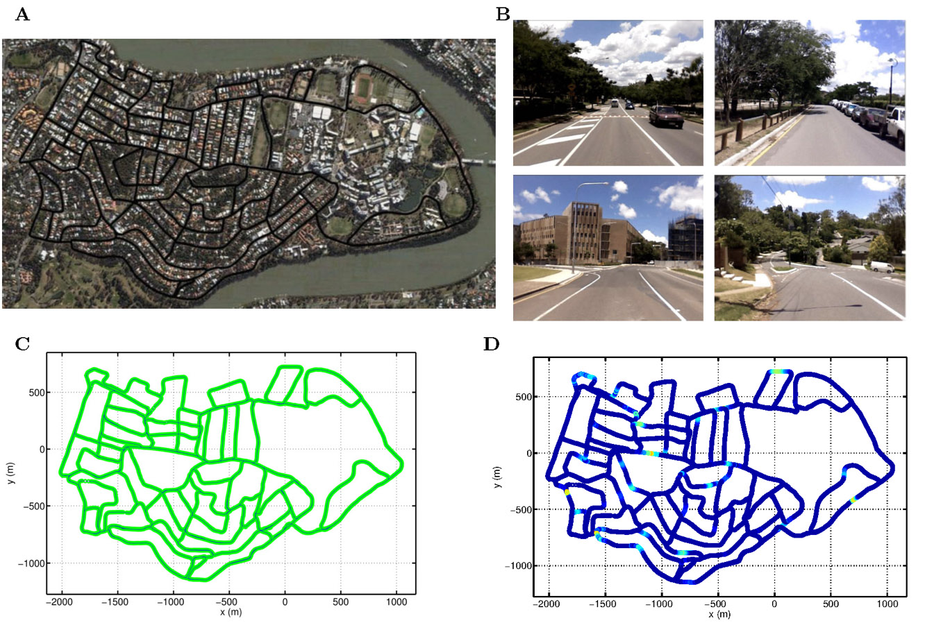 图3 基于栅格细胞的类脑导航方法。(A) 在3kmx1.6km的室外道路环境中构建认知地图。行走的路径总长度为66公里。黑色曲线为道路。(B) 道路中机器人感知的不同类型的场景; (C) 类脑导航算法构建的环境的拓扑地图;(D) 网络中编码低速运动的栅格细胞在环境中的放电图。该细胞在环境中多个区域放电,由于编码低速运动,放电的区域位于转弯或路口处等需要低速运动的地方。