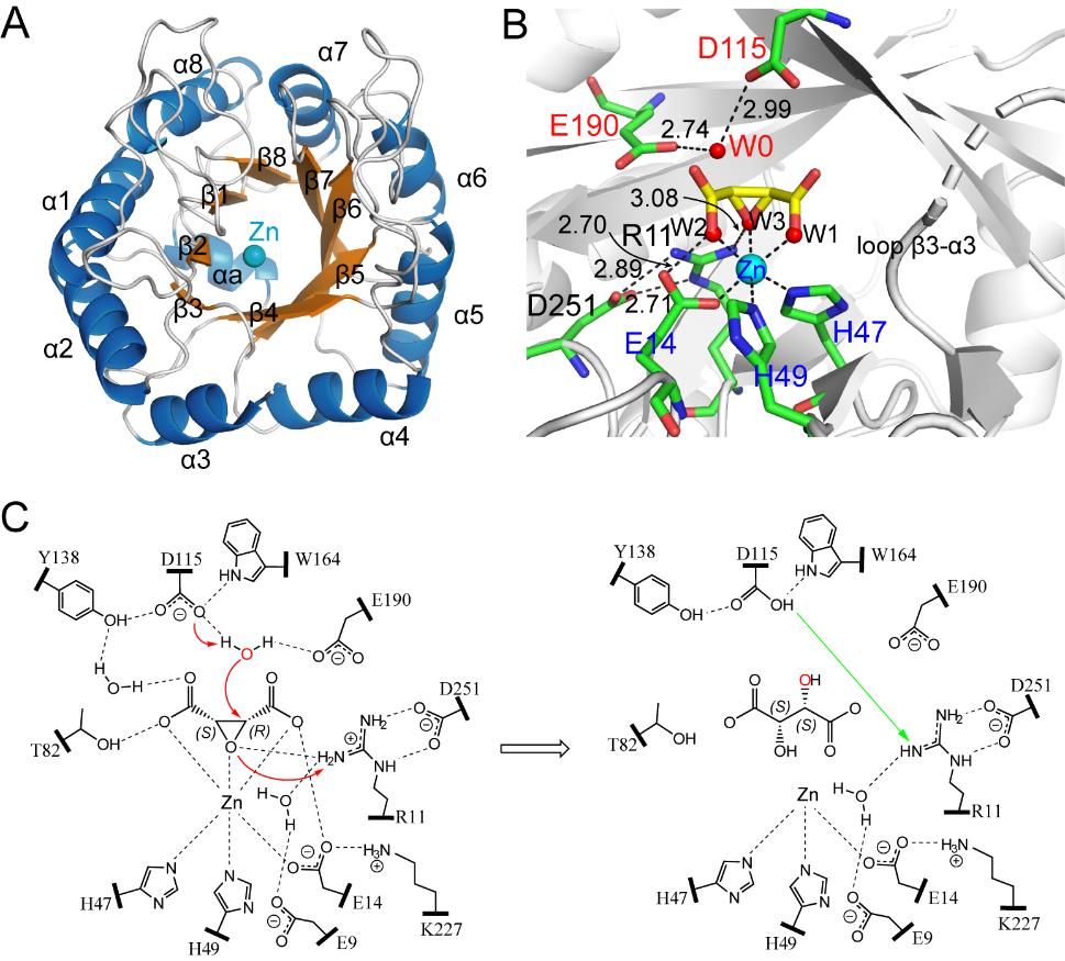 图1 产D(-)酒石酸的顺式环氧琥珀酸水解酶CESH[D]的结构与催化机制。(A)CESH[D]的整体结构。(B)CESH[D]的活性位点结构及推测的底物结合模式。(C)根据结构分析推断的催化机制。