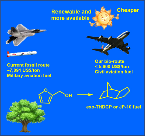 糠醇是农林废弃物中半纤维素部分获得的一种重要的化学品,迄今已有几十年的工业化生产历史。该工作开发了两条以糠醇为原料合成JP-10燃料的新路线,可获得大约65%的收率(以碳计算)。经过初步的经济分析,该生物质路线获得的bio-JP-10的成本低于5600美元/吨。根据国外文献报道,未来糠醇的价格有望降至400美元/吨左右,届时JP-10的成本将可降低至2900美元/吨以下,有望实现生物质JP-10的实际应用。