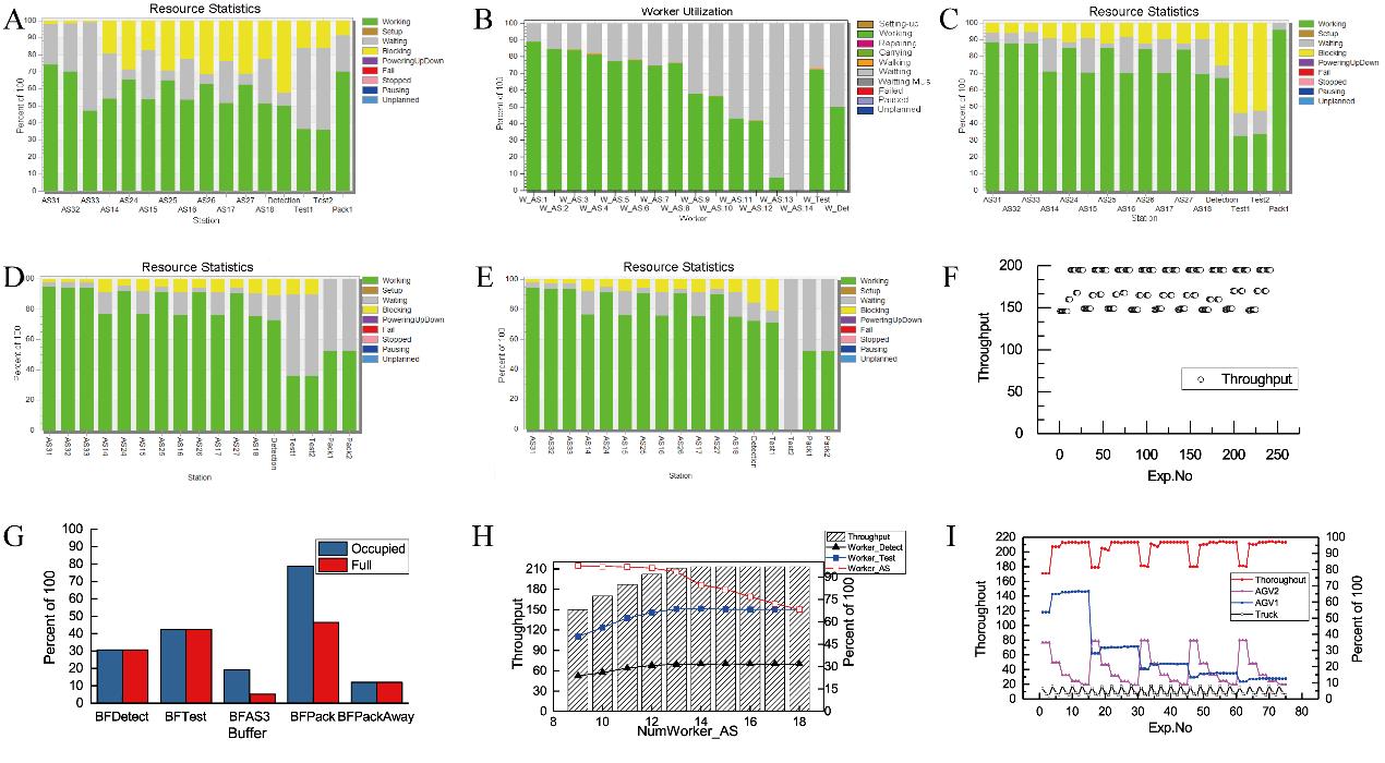 针对数学模型和智能算法进行装配车间性能优化时求解的复杂性和局限性问题,沈阳自动化所智能产线与系统研究室科研人员采用了基于离散事件仿真(DES)与智能算法相结合的优化方法。提出了一种用于DES的通用物流仿真建模方法,统一描述离散车间所有工站的物流过程,快速建立离散车间的生产模型,为复杂离散车间生产仿真提供高效的建模方法。通过采用改进遗传算法和多因子试验优化生产流程、设施布局和生产配置,得到了最优的布局方案和最优的设备配置、人员配置、暂存区配置、物流车辆配置等。
