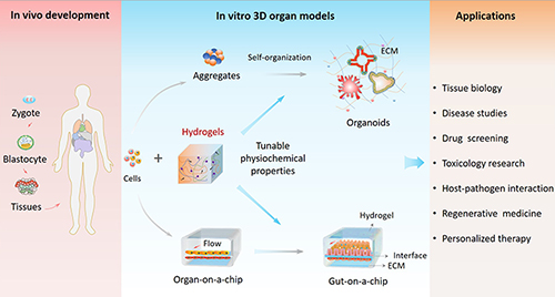 该进展报告重点介绍了目前不同种类水凝胶材料特性(包括天然、合成、杂化水凝胶等),以及其在类器官和器官芯片中的最新研究进展;探讨了水凝胶材料的关键理化因素(如化学成分、结构和机械特性等)对干细胞衍生类器官分化、形成的影响,以及基于水凝胶材料构建的器官芯片类型等;此外,针对当前类器官和器官芯片研究中面临的挑战,从体内组织器官发生到仿生工程学设计策略出发,提出了基于水凝胶材料构建3D类器官模型的策略性指导和可能的解决方案,并对未来该领域发展方向进行了展望。