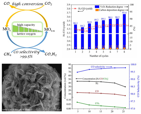 近日,青岛能源所热化学转化研究组的何涛带领研究生葛元征首先从热力学上预测了V2O3作为钒的一种中间态氧化物具有极高的合成气选择性(99.7%)和转化能力(以CH4转化能力为计算标准,已报道的铁基材料为100-200mg/g, 该体系可达420 mg/g 以上),并可通过预还原反应由5价态获得该中间价态的稳定存在。在初步实验基础上,研究人员先后通过形貌控制和元素化学掺杂等方式来进一步优化该体系的动力学反应性能和氧化还原稳定性,先后制备了纳米花球层状Si-V复合氧化物和Pt催化的Si-V复合氧化物,最终将甲烷单程转化率提高到80%以上,合成气选择性>99.5%,载氧体还原度90%以上,并实现了CH4高选择性氧化和CO2还原再生的稳定循环。甲烷、二氧化碳化学链共转化技术的研究对于可燃冰、页岩气的化学利用、温室气体的减排具有重要意义。