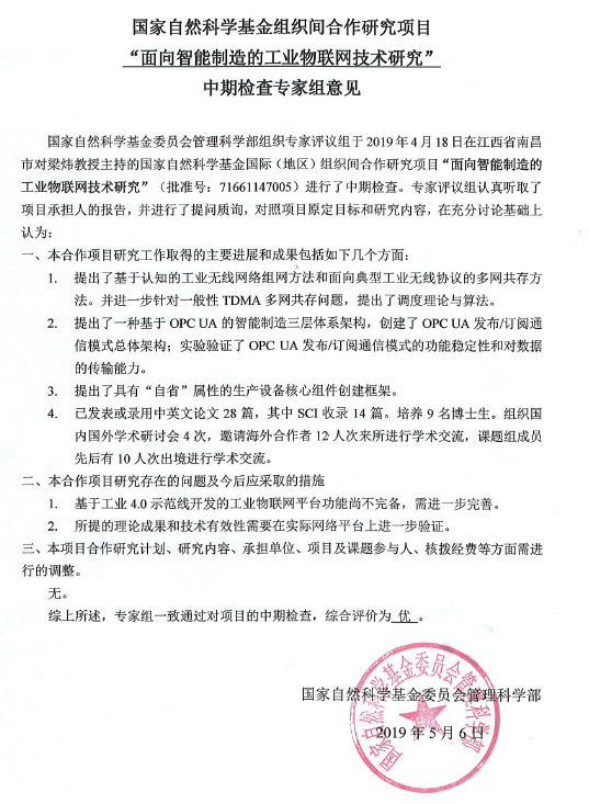 在该项目的中期检查汇报中,项目负责人梁炜研究员总结了本项目的主要研究成果,包括基于认知的工业无线网络组网方法、面向典型工业无线协议的多网共存方法、基于OPC UA的智能制造体系架构、具有“自省”属性的生产设备核心组件创建框架。依托该项目,已发表论文28篇(SCI收录14篇),培养9名博士生。多次组织或参加了国内外学术研讨会,与韩国汉阳大学的Hong教授等学者在工业无线网络与异构共存、面向智能制造的故障预测与健康管理、面向工业4.0的设备信息垂直集成技术开展了深入、广泛的交流。
