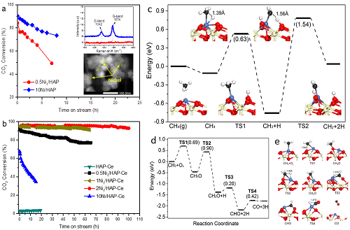 近日,大连化物所催化与新材料研究室研究员乔波涛、院士张涛团队在单原子催化研究方面取得新进展,发现在甲烷干整反应中羟基磷灰石负载镍(Ni)原子催化剂不仅具有高活性,而且具有本征抗积炭性能。研究揭示Ni单原子活性位上CH4发生不完全解离,避免C物种生成,从源头上避免了积碳生成。