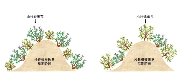 在沙丘植被恢复早期阶段(左)山竹岩黄芪占优势地位,而小叶锦鸡儿在后期阶段(右)占据优势