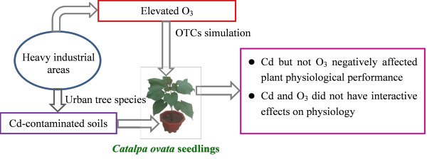 该研究组利用中科院沈阳树木园气候控制实验平台,开展了我国北方城市常见行道树种梓树(Catalpa ovata,俗称“北方梧桐”,一种重要的城市绿化和造林速生树种)对臭氧及土壤重金属复合污染的生理生态响应研究(图1)。结果表明:高浓度臭氧对梓树生长及抗性生理代谢无显著影响,证实了梓树具有较高的耐臭氧能力,而土壤镉添加显著抑制了该树种生长并对其生理代谢包括矿物营养元素含量变化产生显著影响,表明梓树对土壤镉污染比臭氧更敏感,同时发现两种污染物复合对该树种生长等影响无显著交互作用,这与前不久该团队研究的结论(二者对臭氧敏感树种杨树影响存在显著交互作用---Ecotoxicology and Environmental Safety,2019,174:35-42)相反,进一步表明了树木对臭氧和重金属及二者复合响应与敏感性存在显著种间差异,不同树种对两种污染物的复合响应可能存在不同的生理代谢或分子应答机制。这些研究结果可为我国应对气候变化和区域环境污染的树种选择及土壤生态修复等方面提供重要科学依据。